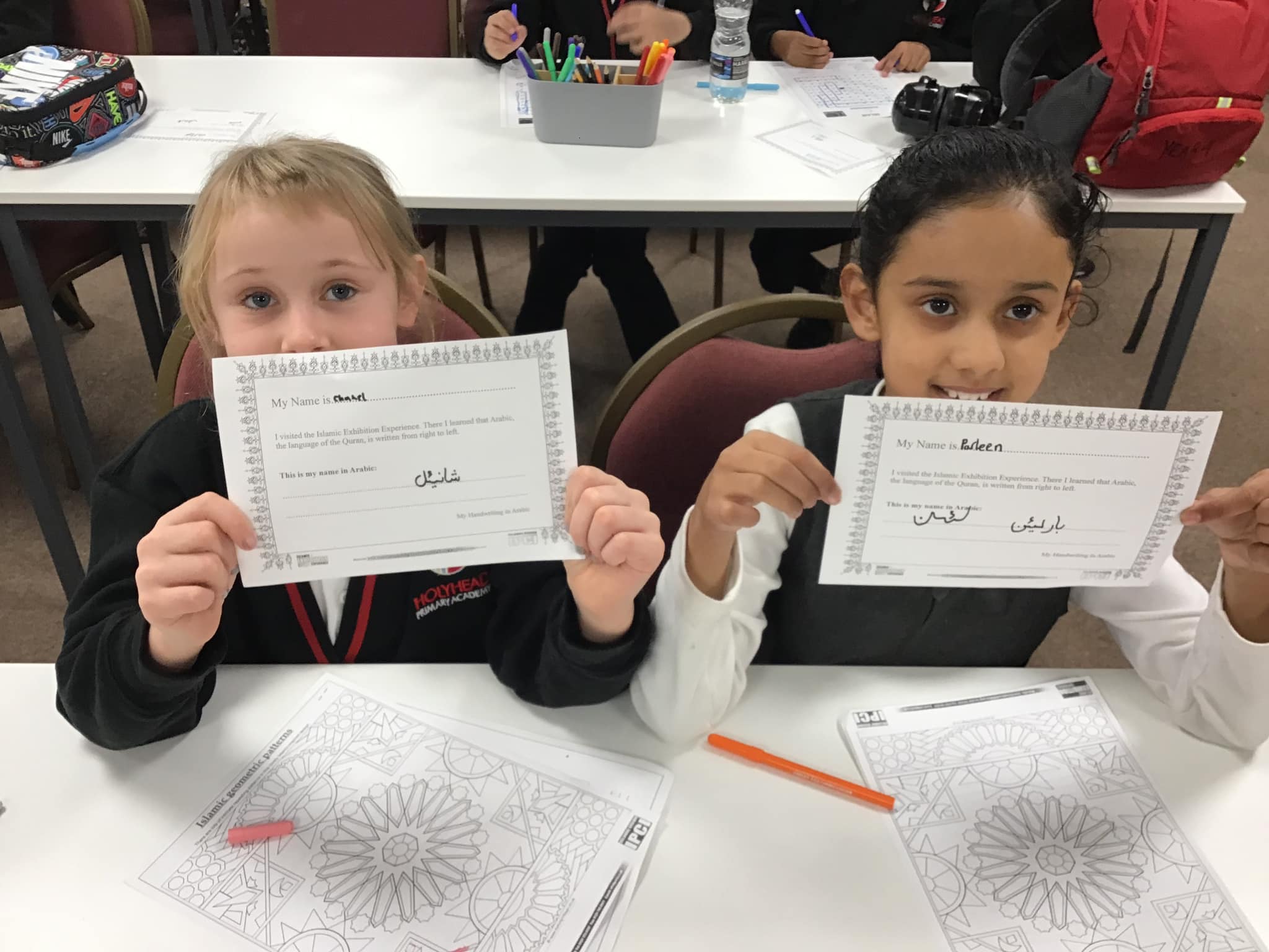 Pupils took part in a question-and-answer session after the exhibition, where they asked thoughtful questions that deepened their understanding of Islam and the value of cultures and diversity within communities. Following the exhibition, pupils were able to try their hand at writing their names in Arabic, guided by tutors who explained the significance of their names and that of language in the Qu’ran.